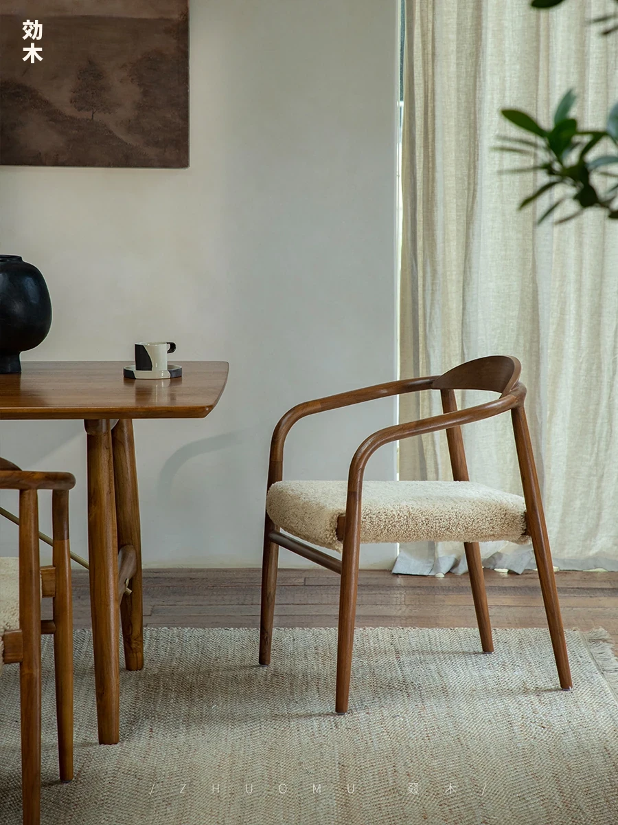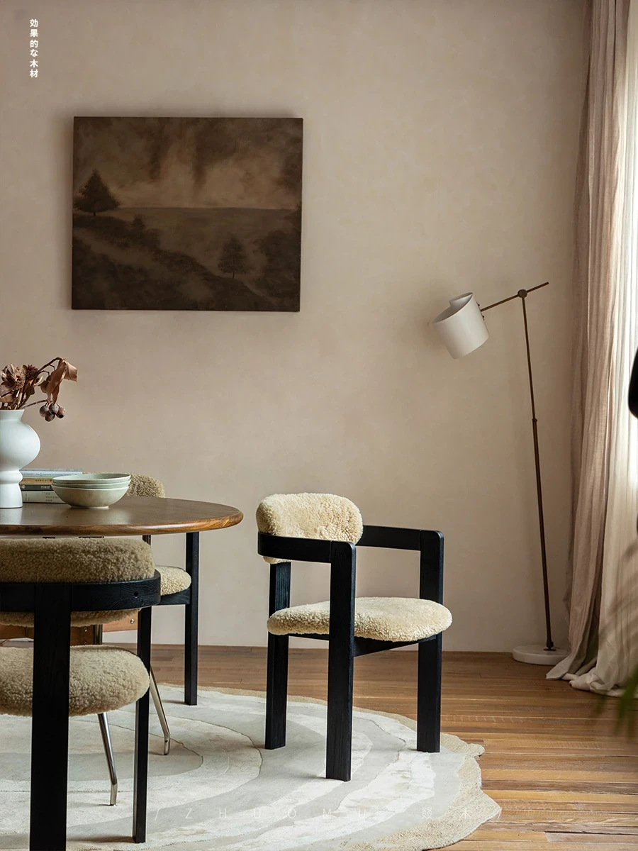 叕木|フレンチヴィンテージデザインのクリエイティブなラムウール&チーク無垢ダイニングチェア - 静寂を楽しむ書斎椅子