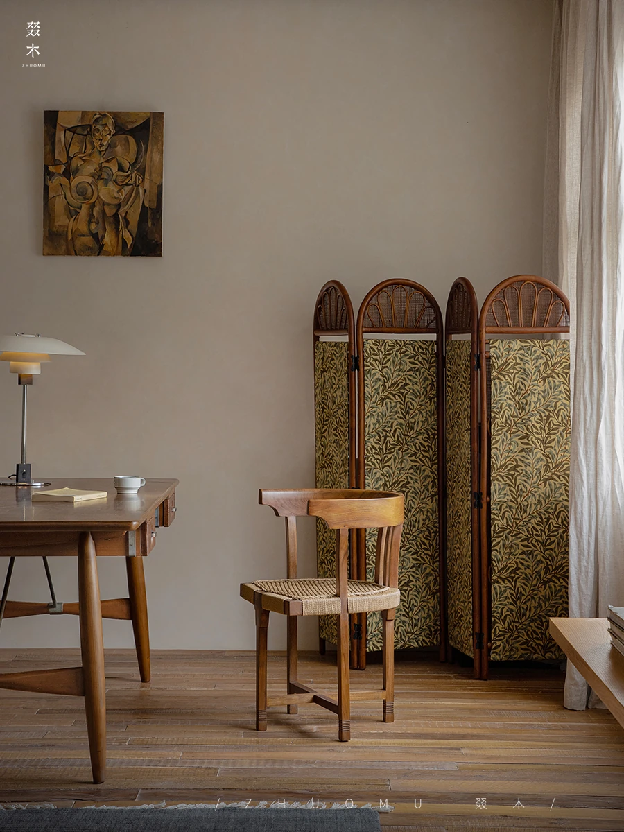 Zhuomu | Wabi-Sabi Style Imported Teak Circle Chair and Vintage Solid Wood Rattan Dining Desk Chair - Perfect for Home or Office Decor!