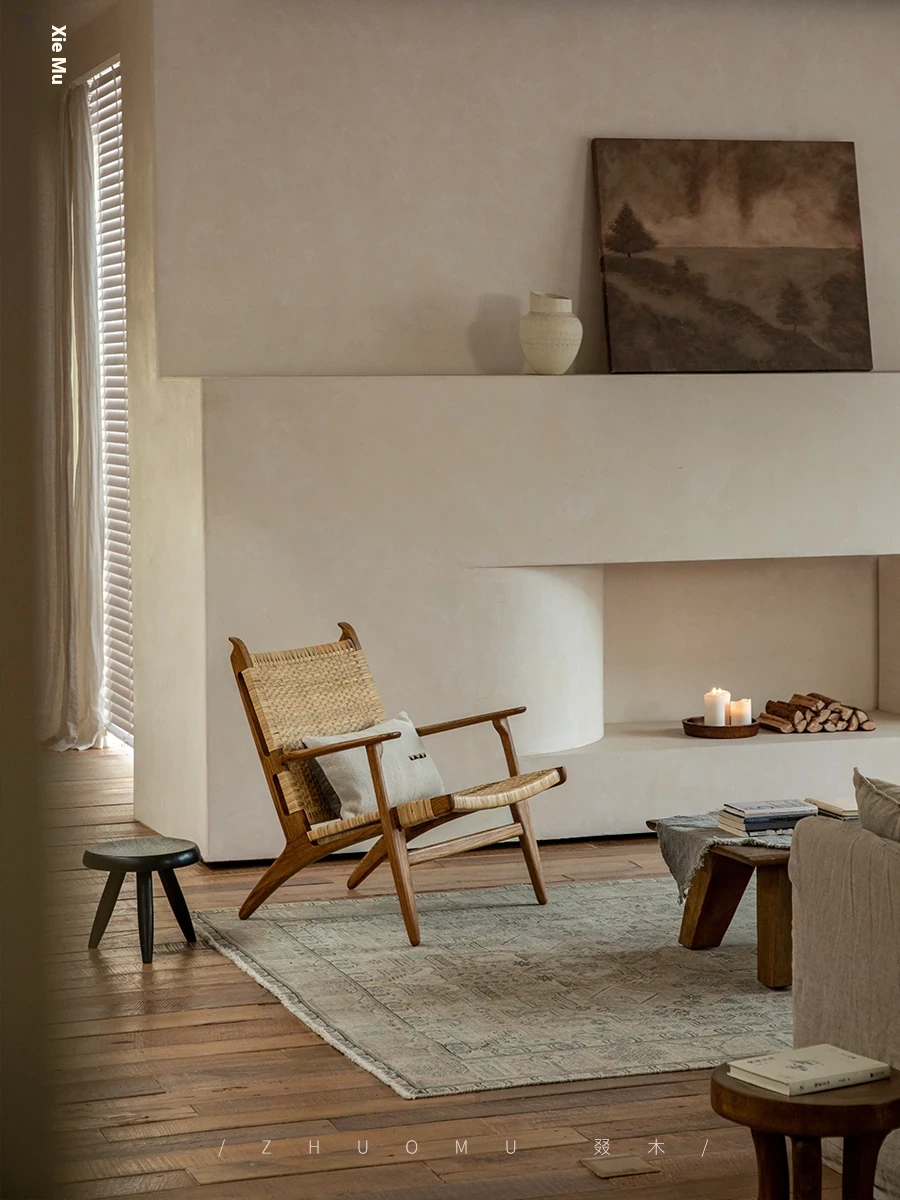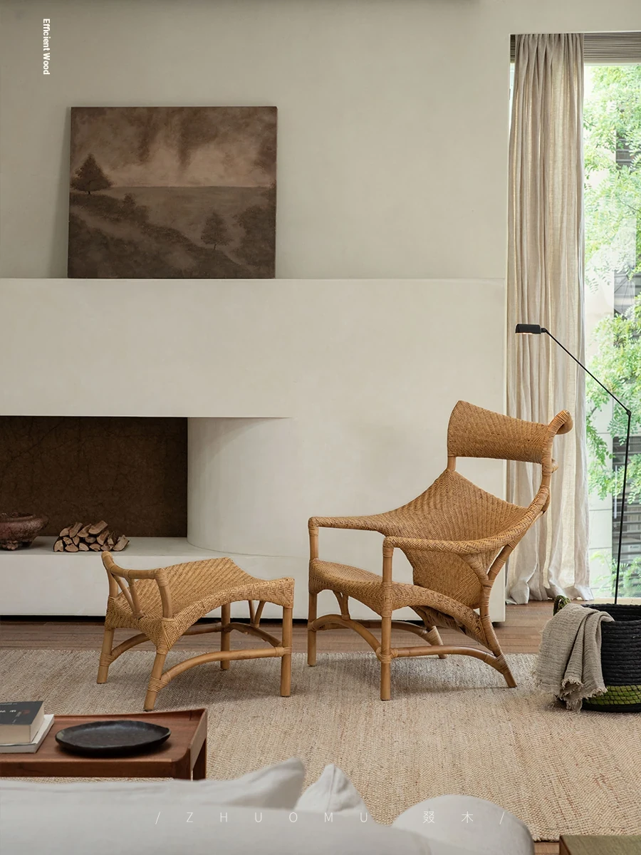 ZhuoMu | Vintage Reproduction of Danish Wabi-Sabi Rattan Lounge Chair – Retro Solid Wood Horn Chair for Stylish Relaxation