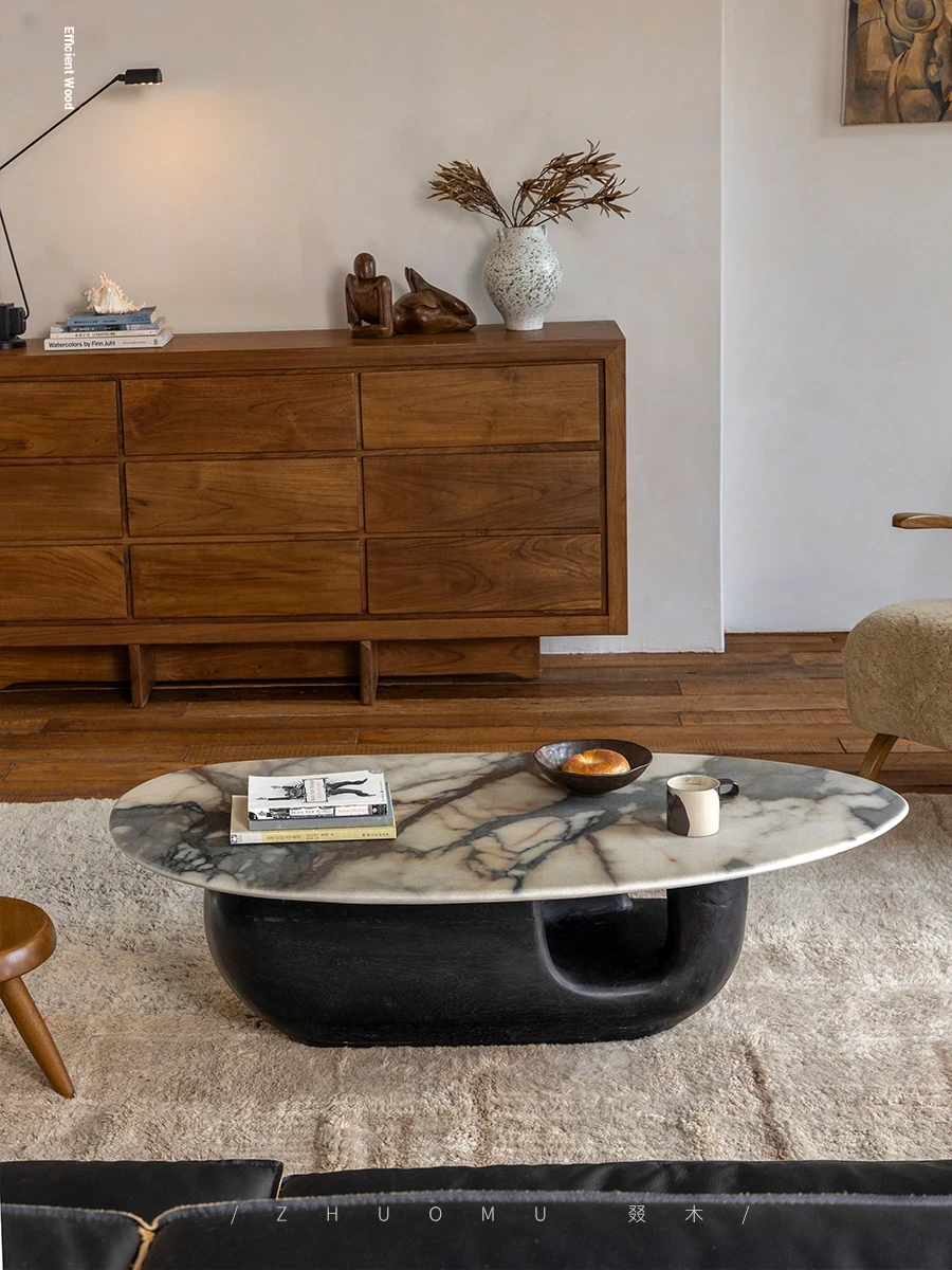 "Zhue Mu Zen-Inspired Wabi-Sabi River Stone Coffee Table – Vintage All-Massive Wood Designer Furniture for Chic Living Rooms in Chinese Style"