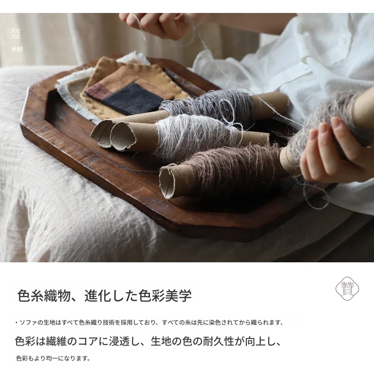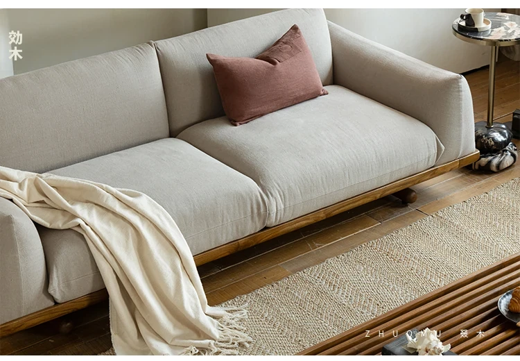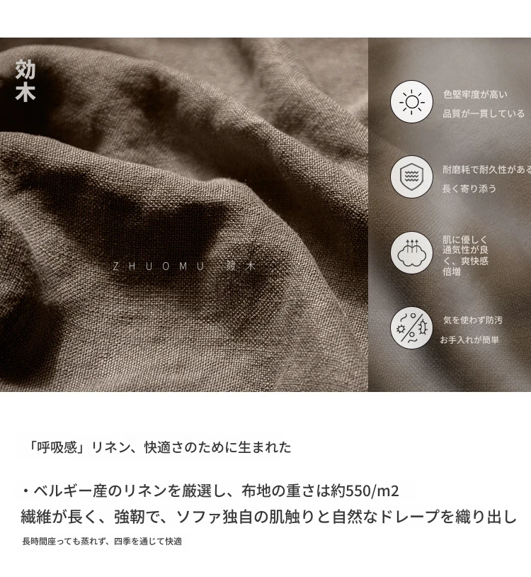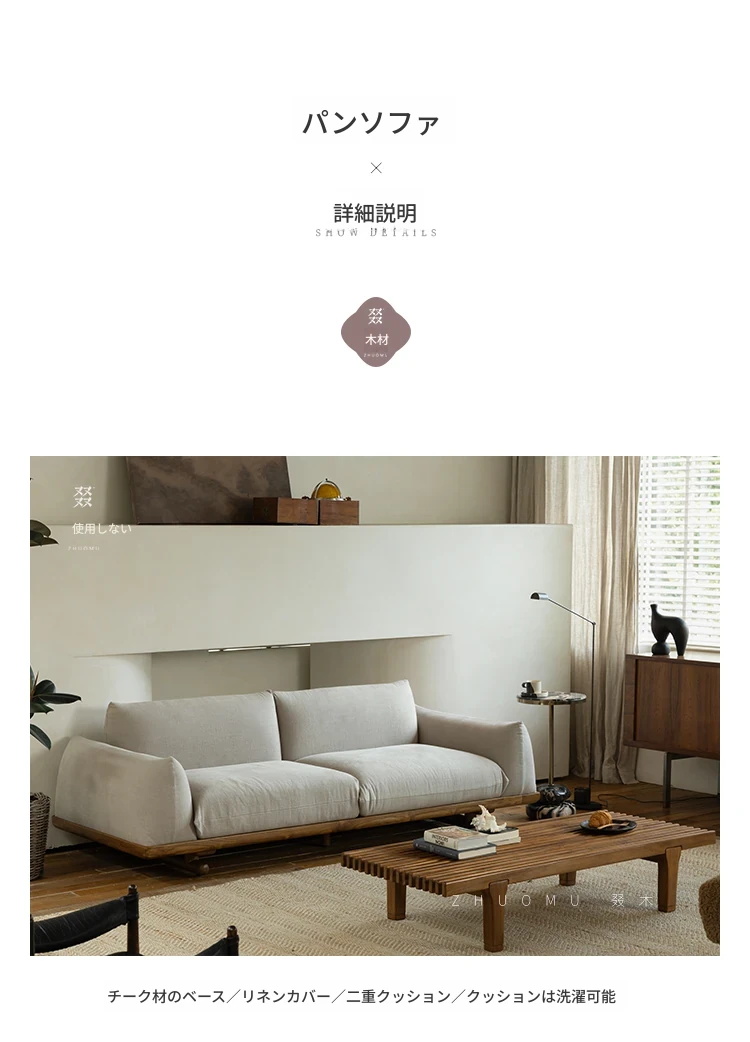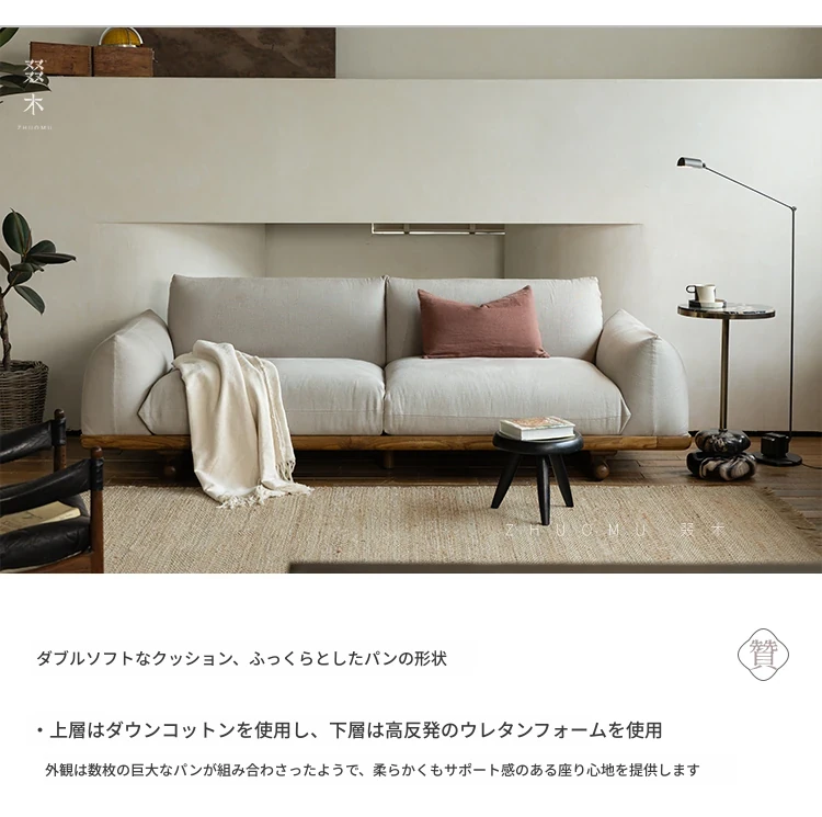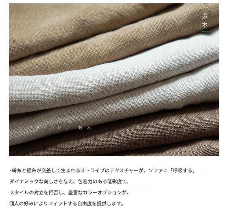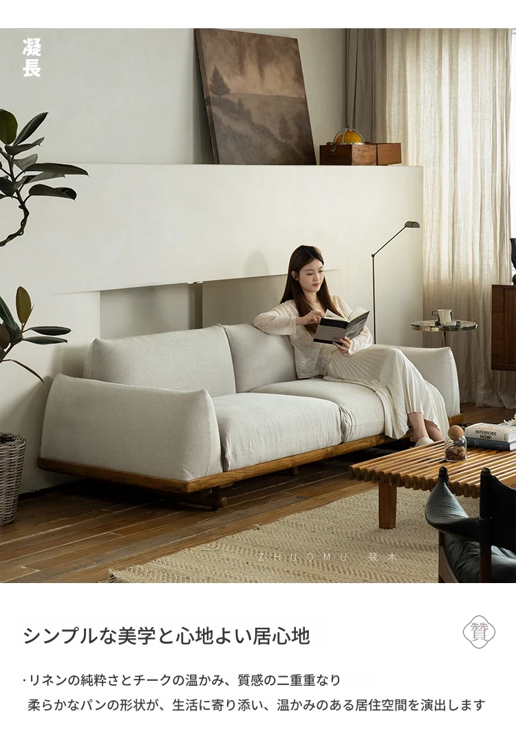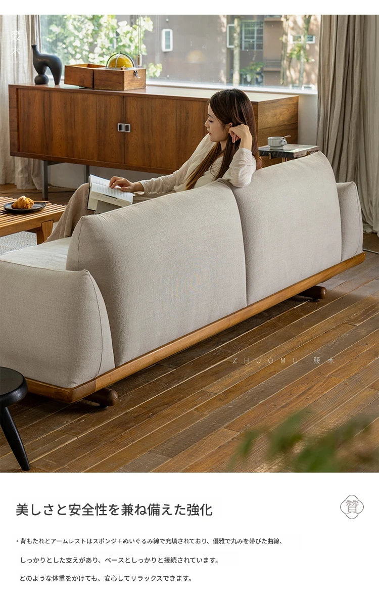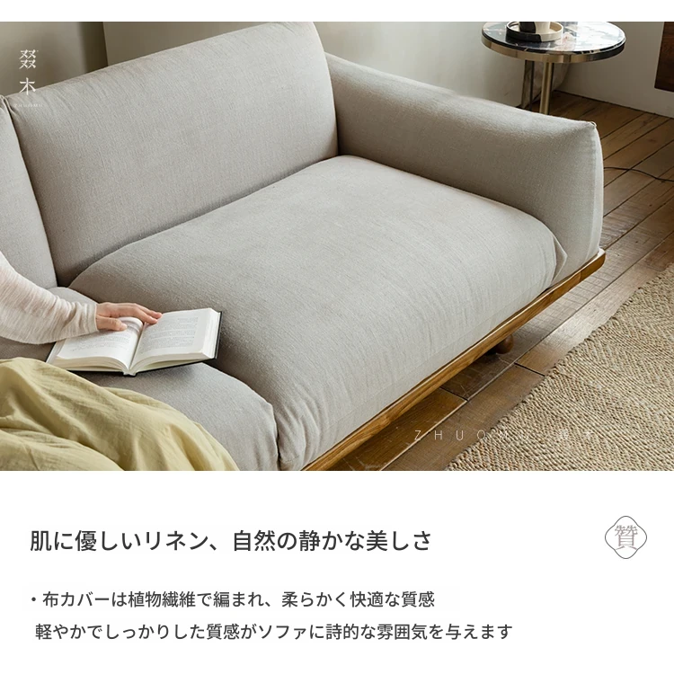 叕木|北欧インス風のレトロな侘寂スタイル✨インドネシアのユーカリウッドとリネンを使用した、3人掛けの実木布張りソファ。心地よい座り心地で、あなたのリビングに温かみをプラス!