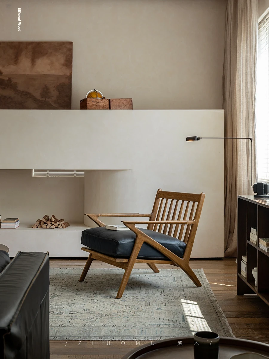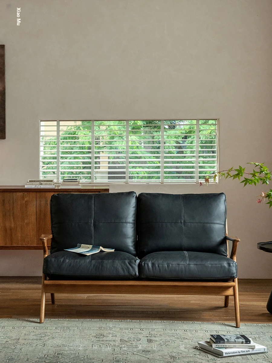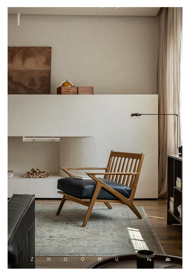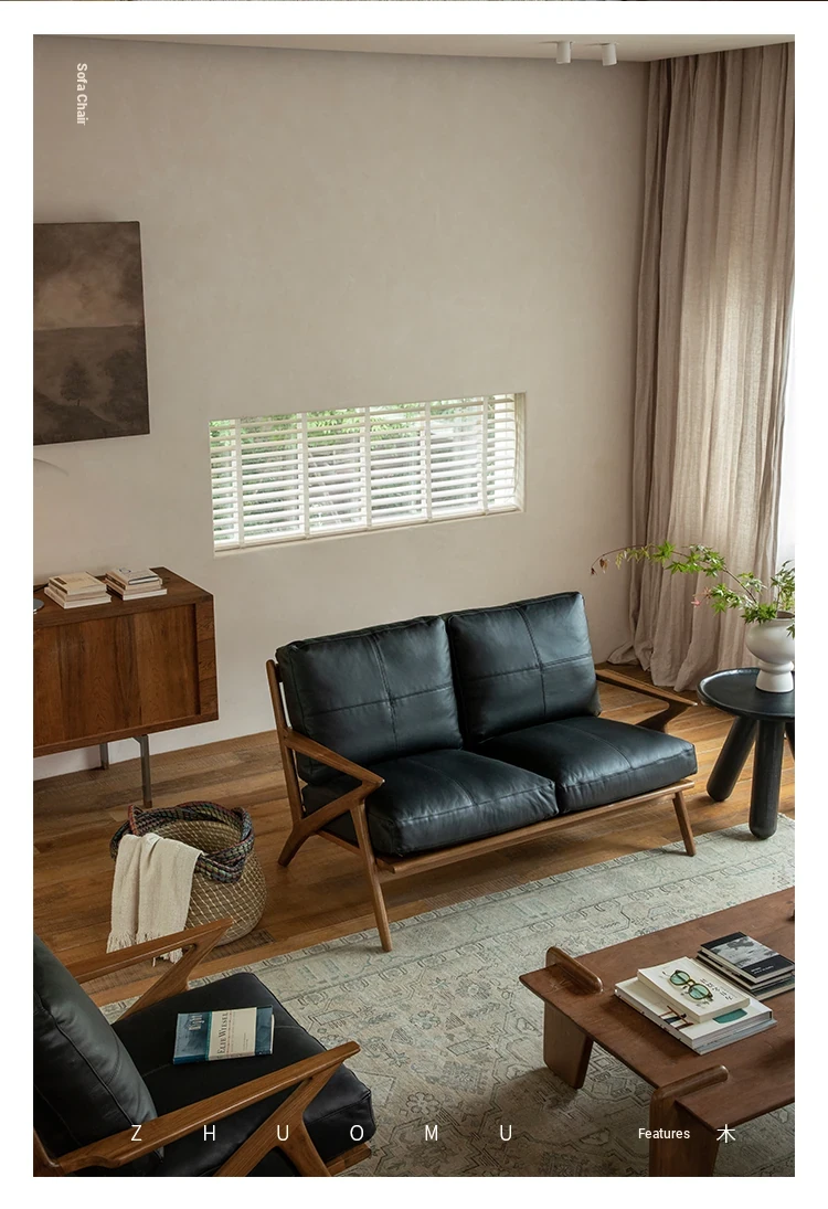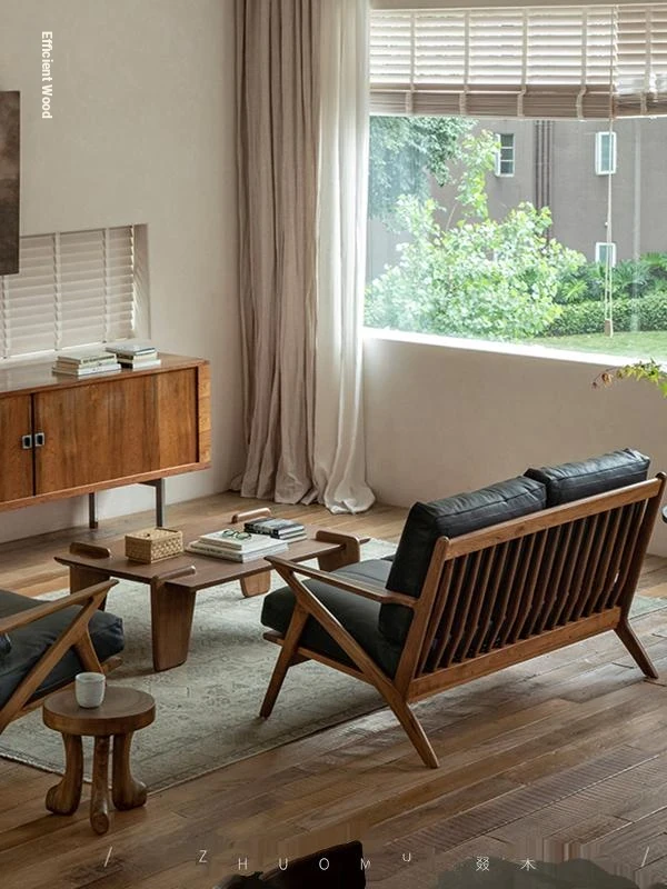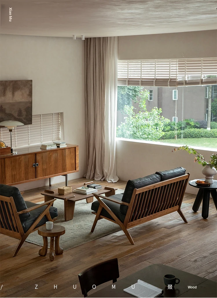 DuoMu | Vintage-Inspired Designer Solid Wood Teak Lounge Chair for Two – Perfect for Hotels & Guesthouses, Featuring Genuine Leather Upholstery