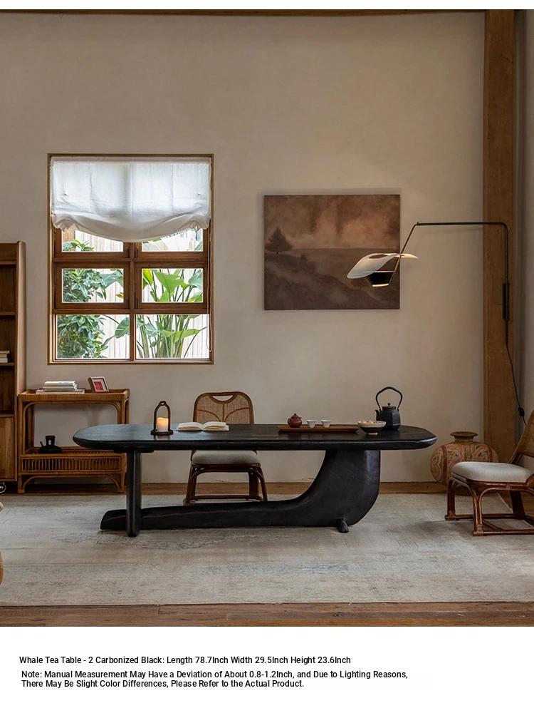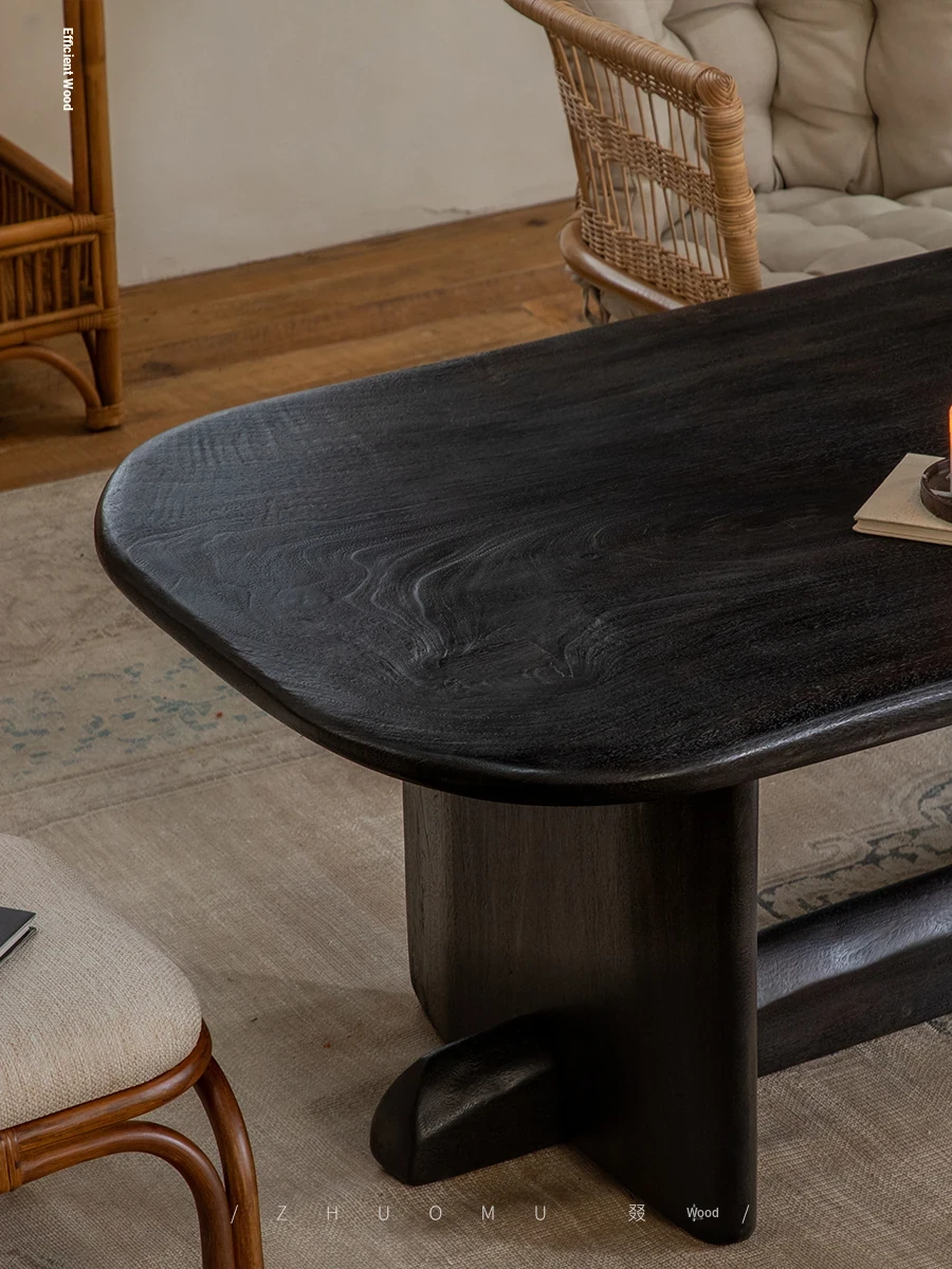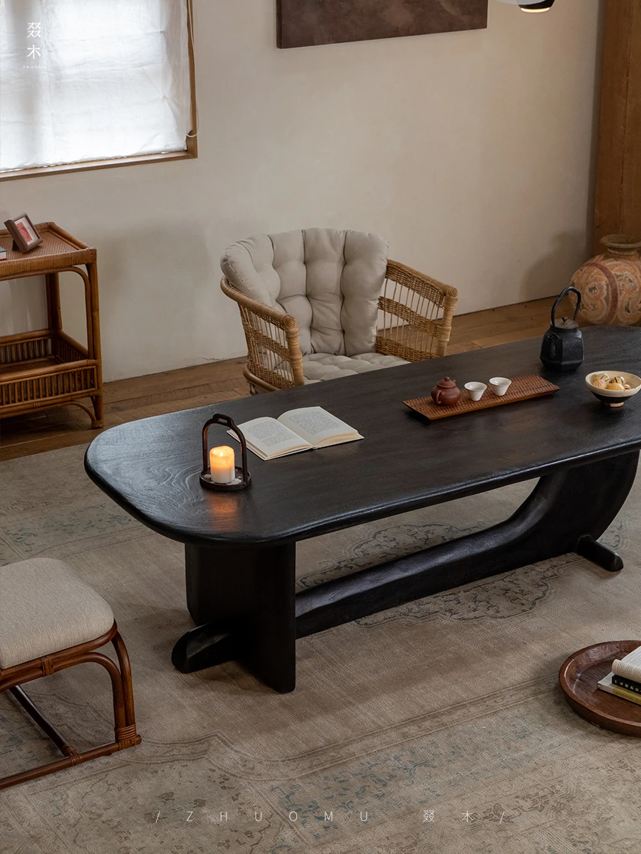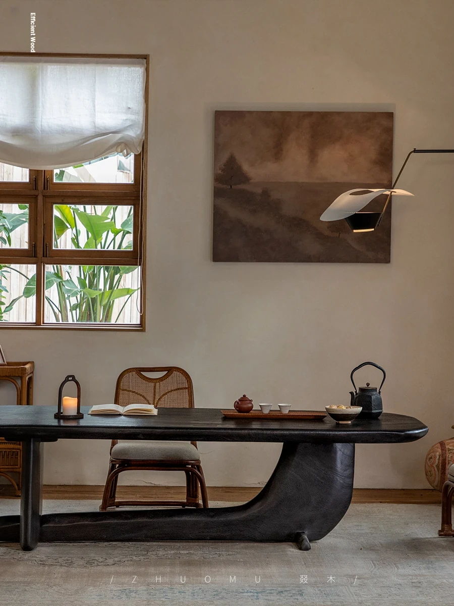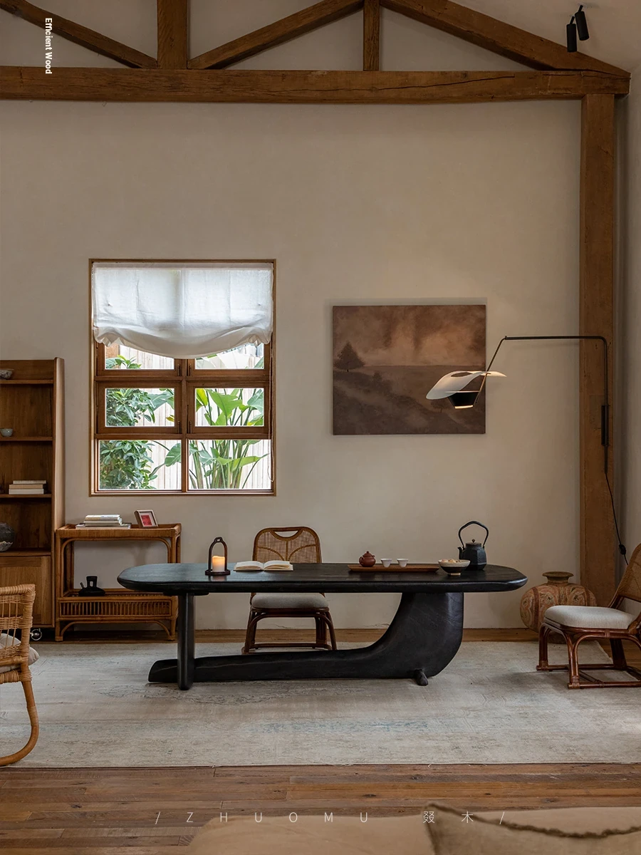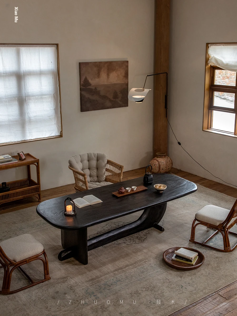 叕木|中古侘寂スタイルの全実木で作られたヴィンテージ風創造的茶室用長方形テーブル - ブラックロングテーブルで、民宿にぴったりの洗練された雰囲気を演出!